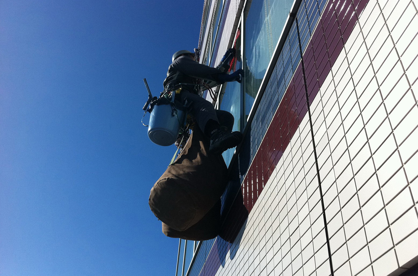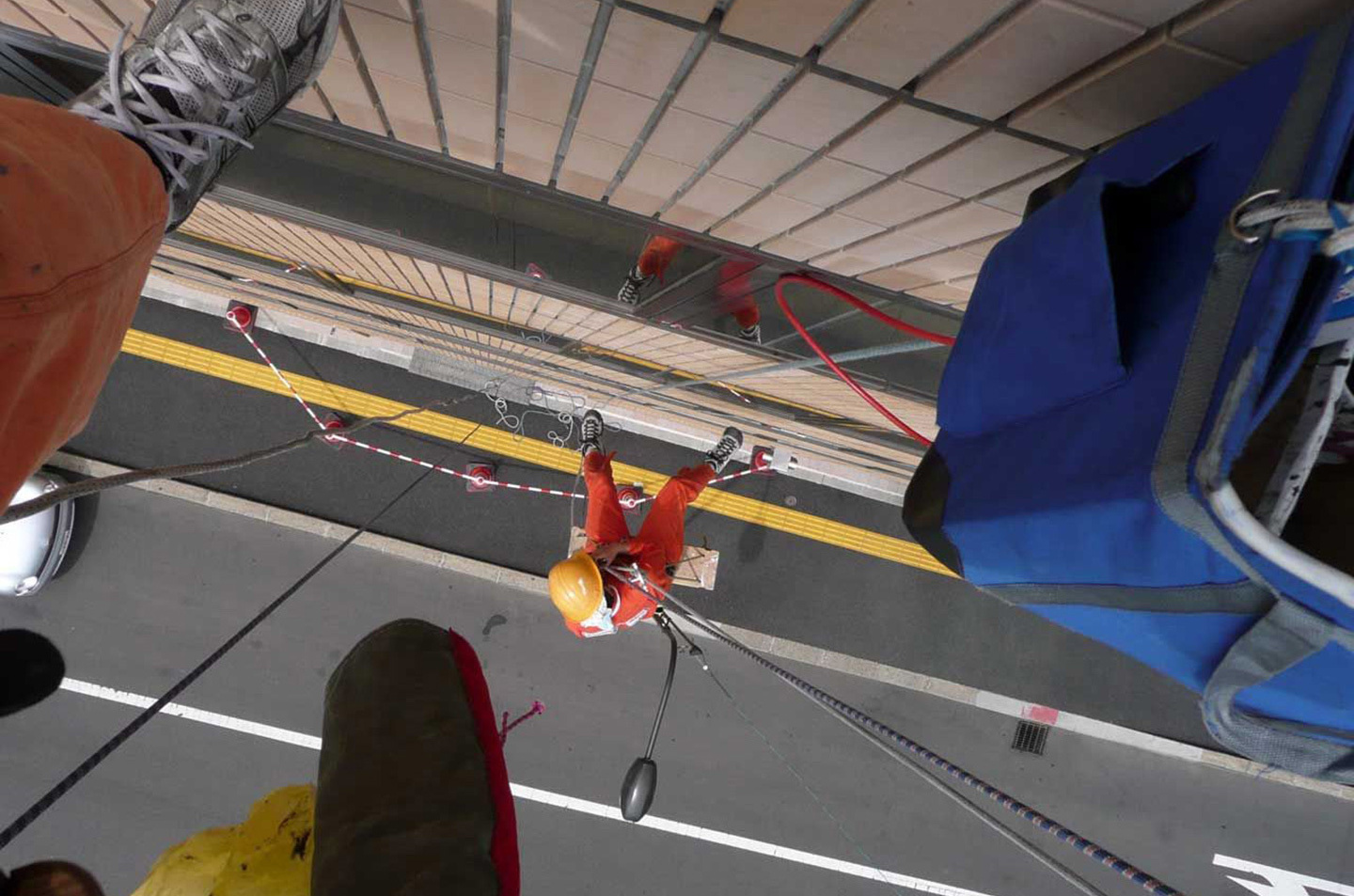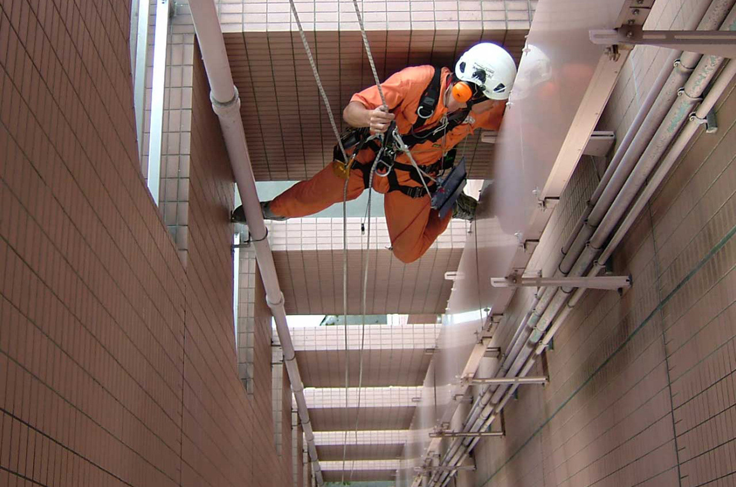 特殊高所作業(ロープブランコ作業)による清掃、各工事(防鳥ネット取付、タイル打診調査等) 各清掃作業